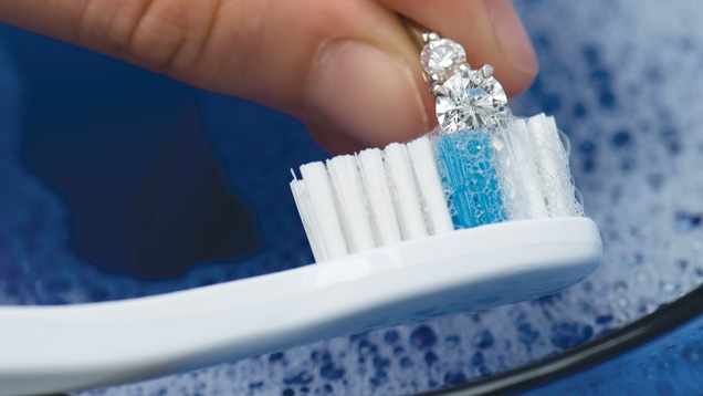 A simple plan to keep your diamond jewellery looking beautiful is to soak it in a gentle degreasing solution, such as water with a few drops of mild dish soap, once or twice a week. After you remove the diamond from the cleaning solution, use a soft, clean toothbrush to remove any remaining dirt. The toothbrush should be new and reserved exclusively for cleaning your jewellery. It is hard to reach places like the back of the diamond, which tends to collect the most oil and dirt.
